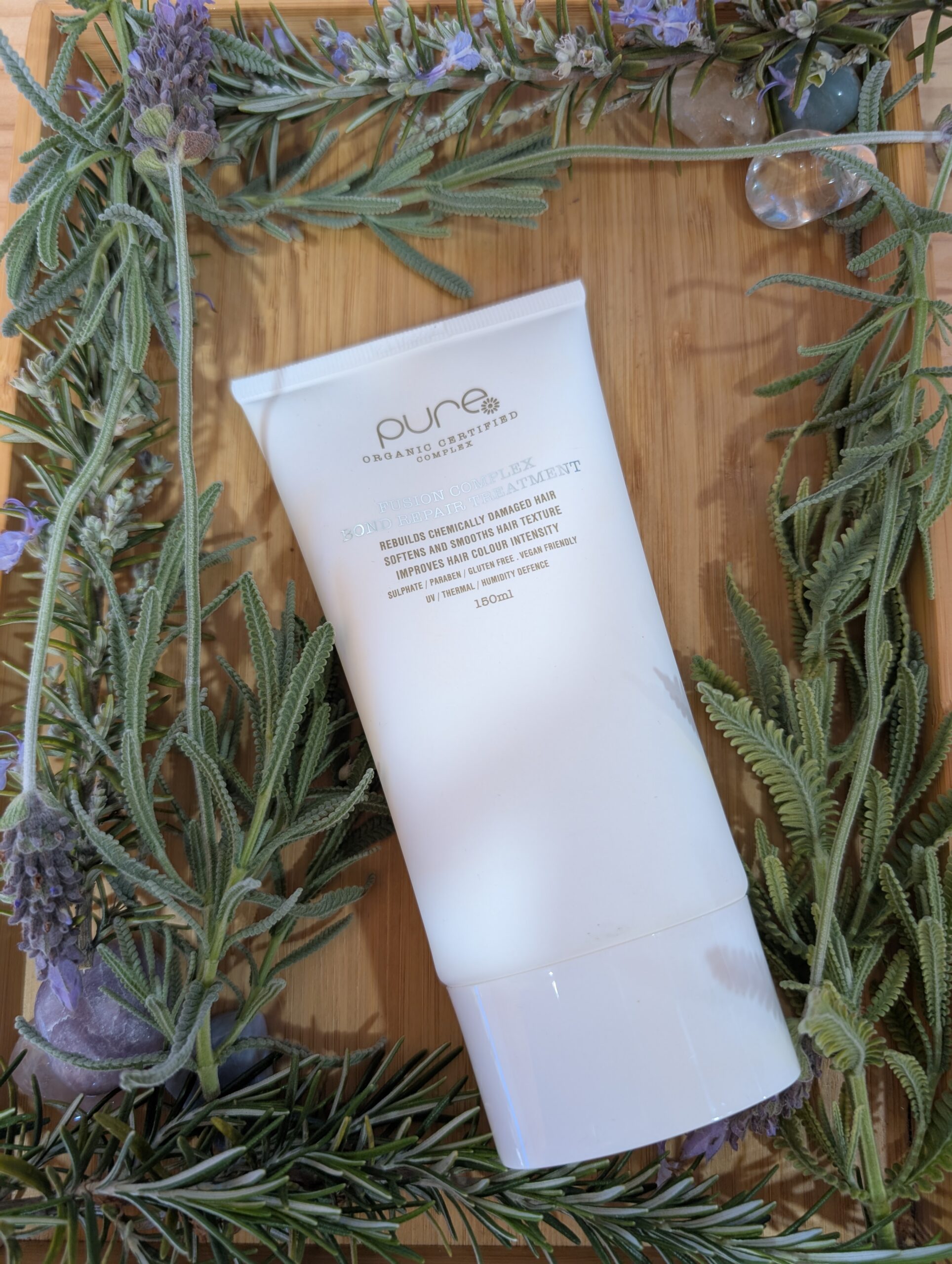 Pure Fusion Complex Bond Repair Treatment prevents damage and repairs hair integrity from chemical salon processes. Protecting the bonds from initial breakage as well as repairing broken bonds. Infused with Pure’s Organic Certified Complex™, Fusion Complex noticeably softens and smooths hair texture.