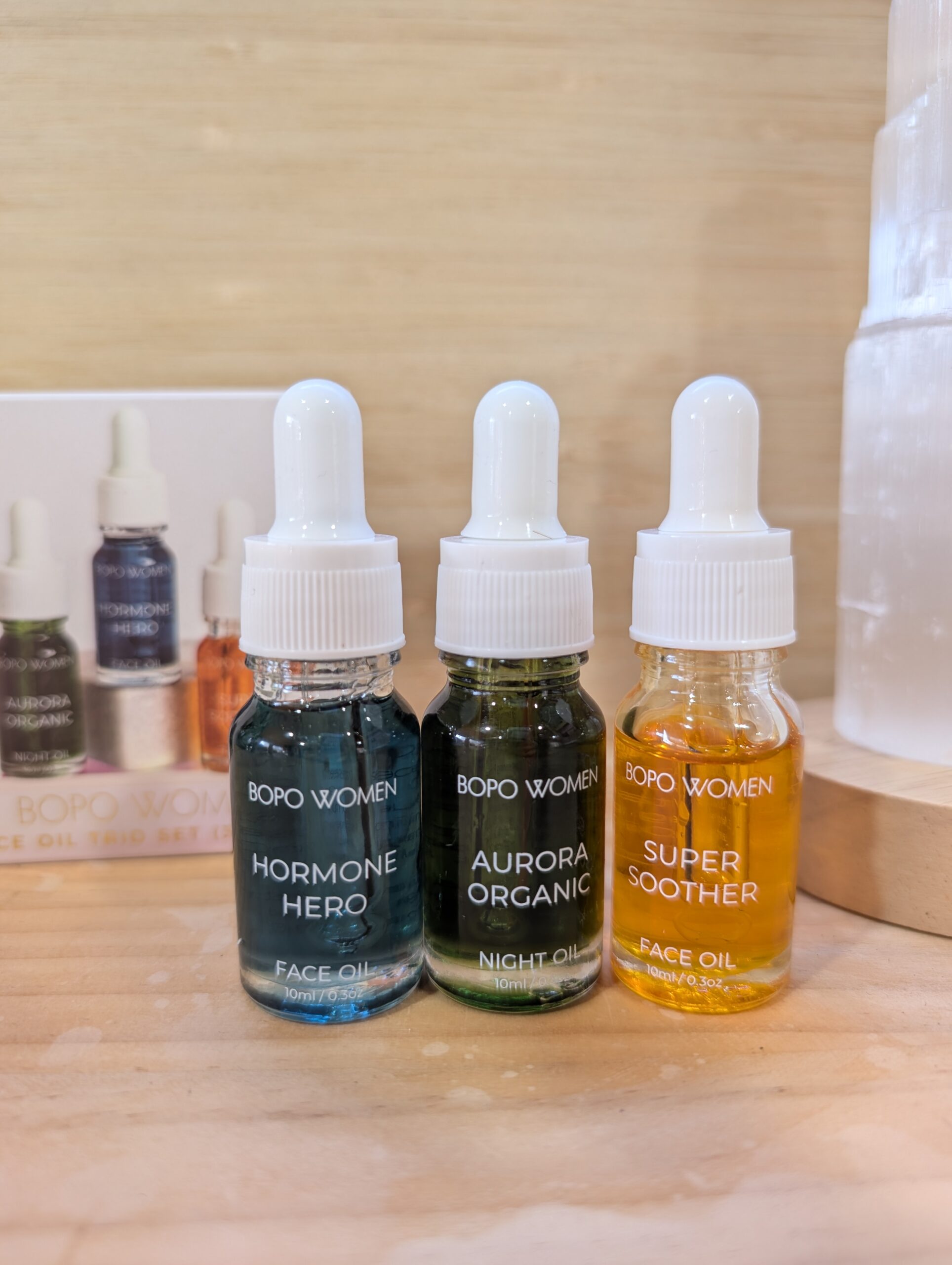 This set pairs three mini (3 x 10 ml) versions of our Bopo Women Face Oils in a beautiful gold foil gift box