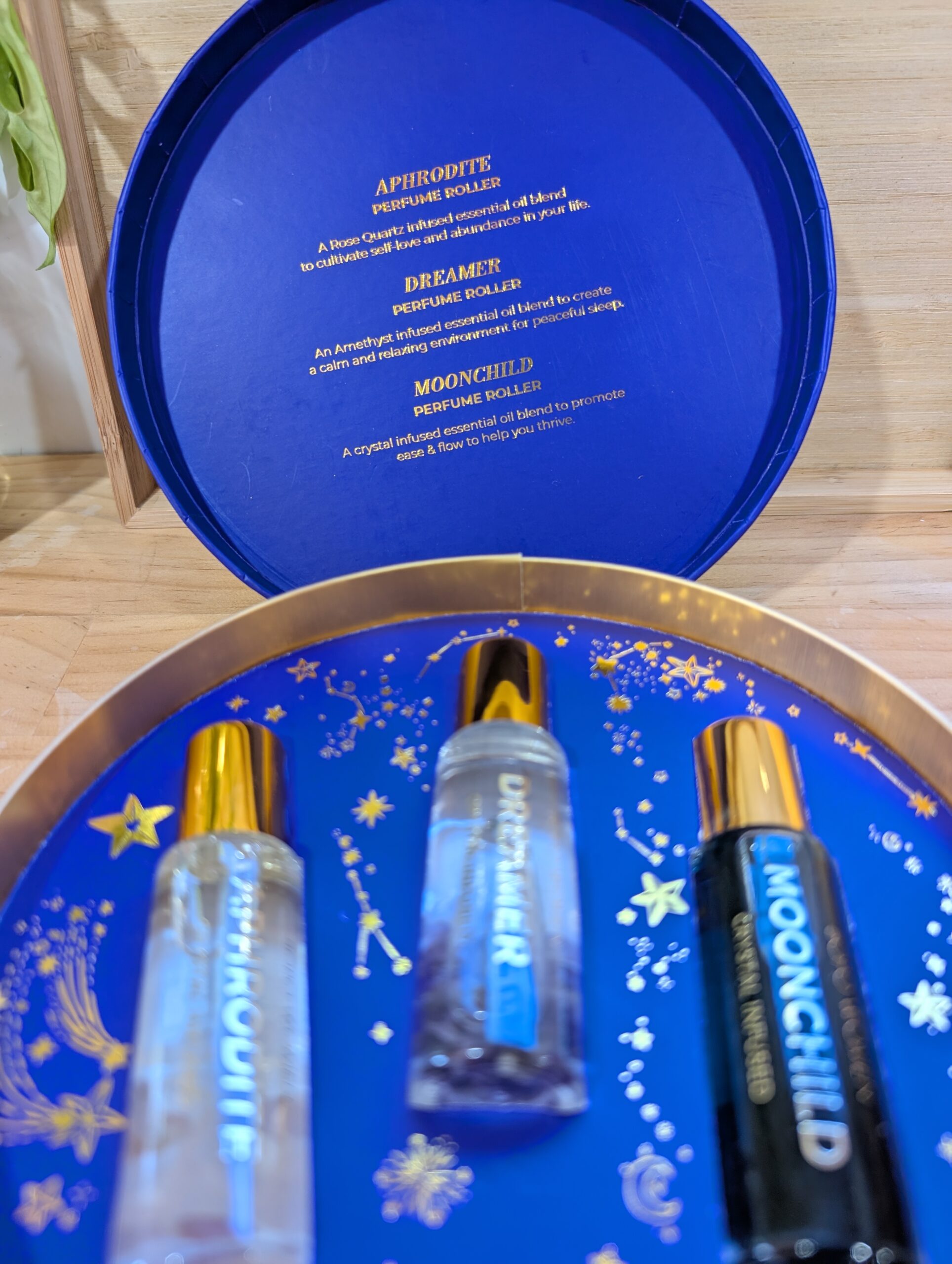 The three best-selling crystal infused essential oil perfume rollers, packaged in a beautiful gift box. These refined essential oil blends are amazing as a light natural perfume alternative and they’re also the perfect gift for that special someone.